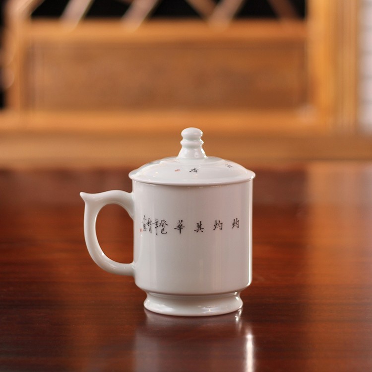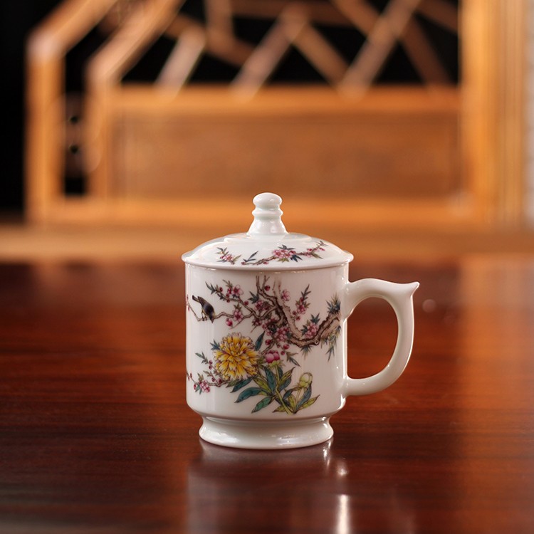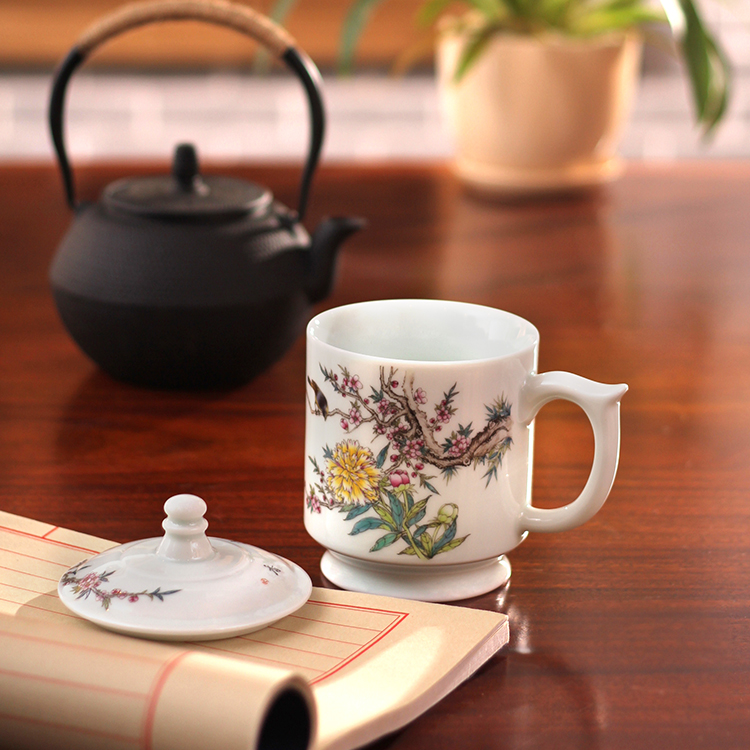 桃之夭夭,灼灼其華,粉紅的桃花與鮮黃的芍藥交相輝映,秀出一片旖旎。這款茶杯粉彩工藝,色彩秀麗,圖設清新,畫師筆觸細膩,艷麗的花、舒展的葉、歡快的鳥,奏出生命美麗的樂章。